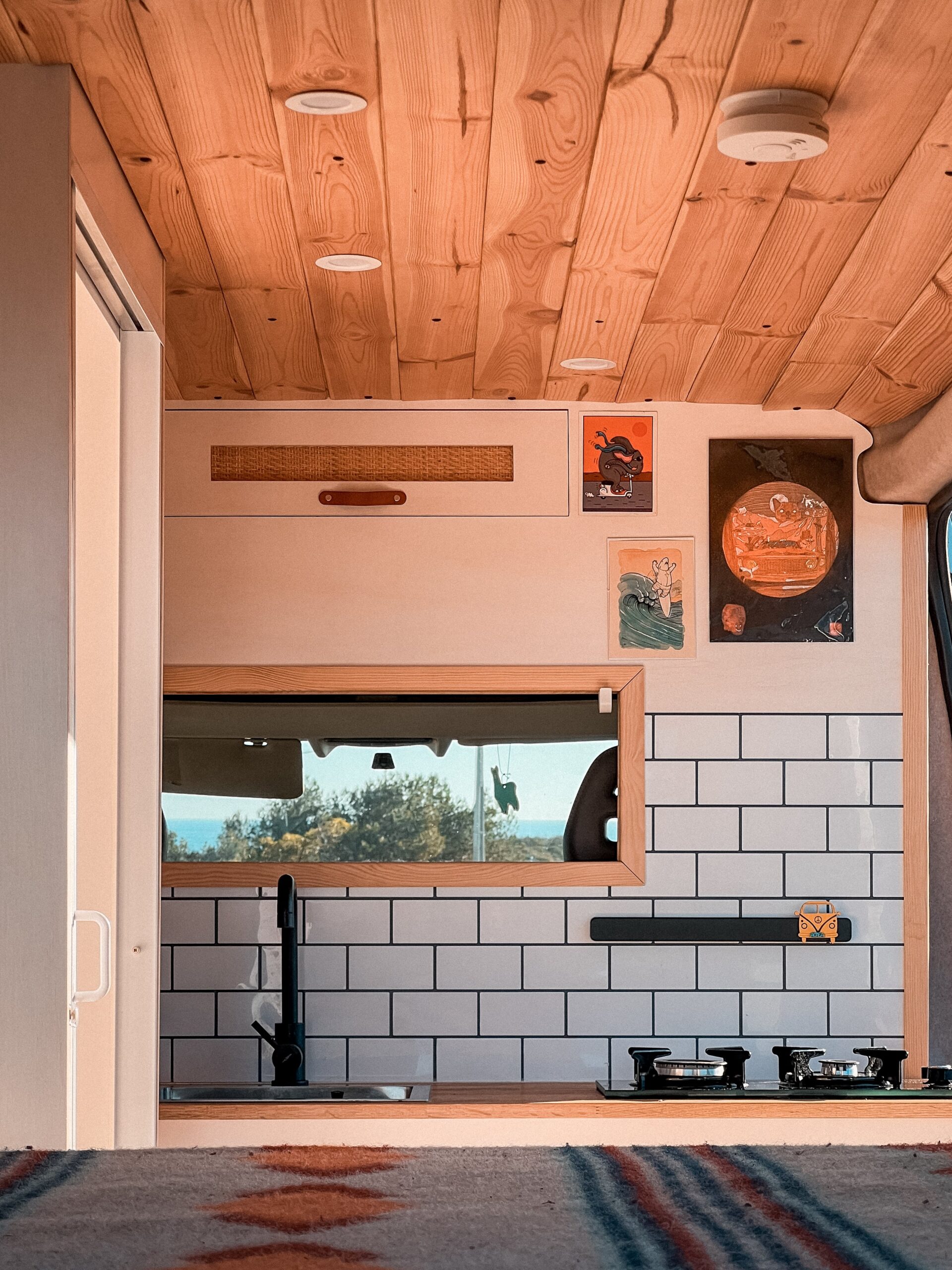 Mimo że kamper bazuje na „średniaku” L2, dzięki szerokości pojazdu i przemyślanemu układowi zabudowy, udało nam się stworzyć bardzo przestronny dom na kółkach. Olga chciała, aby użyte materiały były naturalne, więc egzotyczna sklejka, z której wykonano meble, została zaimpregnowana na biało, co nadaje wnętrzu ciepły i domowy klimat.