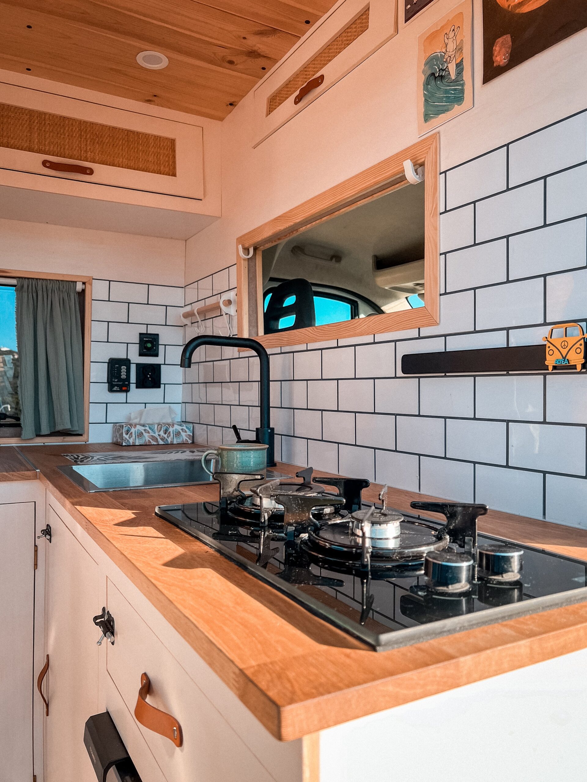 Kamper został zaprojektowany z naciskiem na funkcjonalność i oryginalność. Olga chciała dużą kuchnię, przestronność, chowaną toaletę oraz możliwość spożywania posiłków na świeżym powietrzu. Dlatego zdecydowaliśmy się na odgrodzenie przestrzeni szoferki od części mieszkalnej. Za szoferką umieściliśmy przestronną kuchnię w kształcie litery L, która oferuje mnóstwo miejsca do przygotowywania potraw.