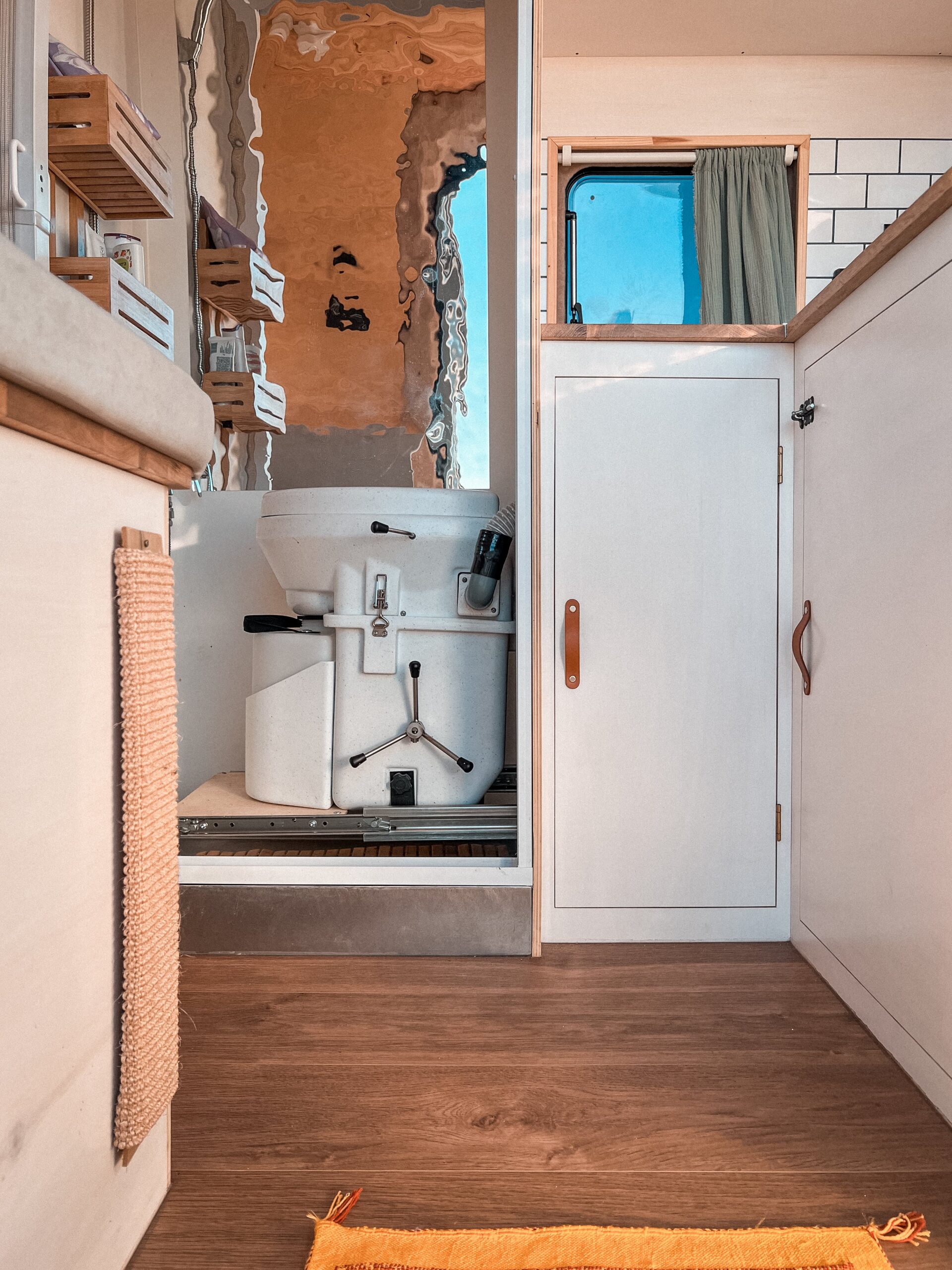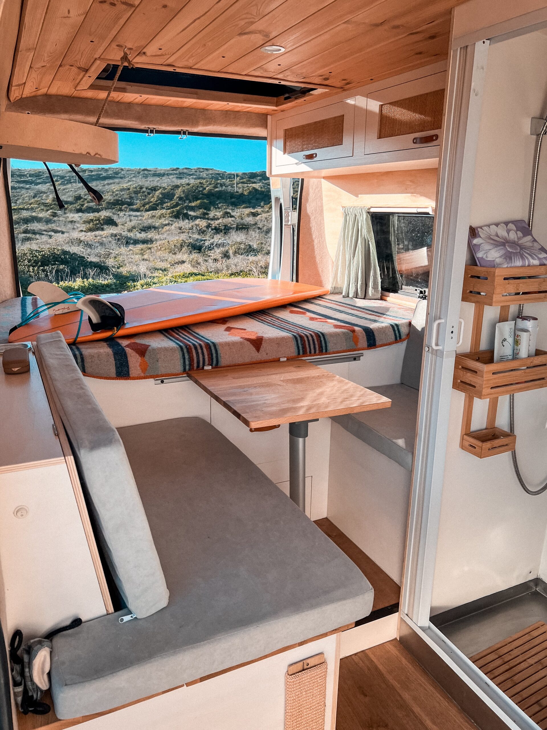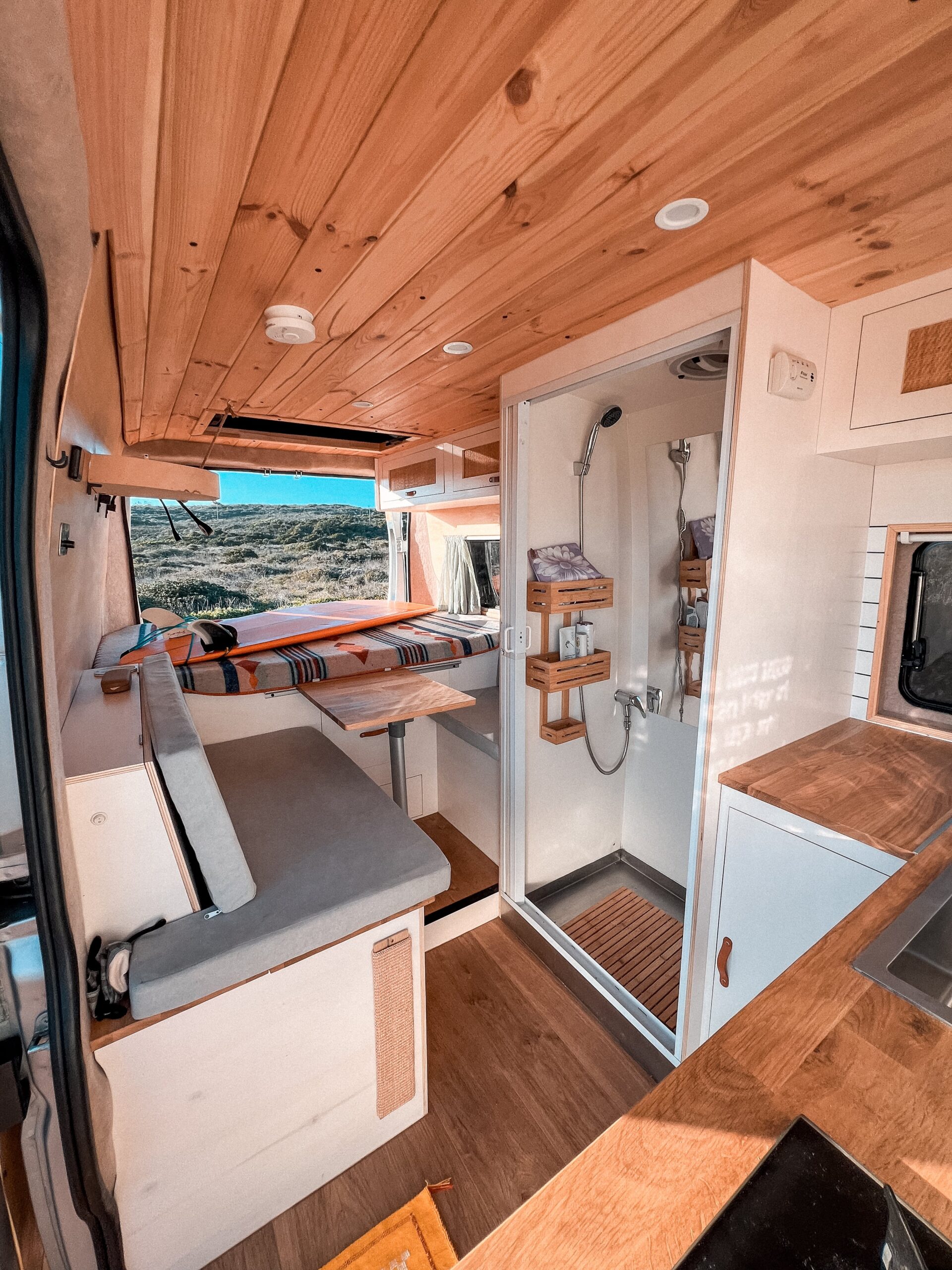 Bezpośrednio za kuchnią znajduje się duży prysznic z systemem wyjeżdżającej toalety separacyjnej, wyposażonej w wentylację mechaniczną, co znacznie poprawia komfort użytkowania. Dalej w kamperze zaprojektowaliśmy dwa siedziska z niewielkim stolikiem pomiędzy nimi, idealne do pracy i spożywania posiłków. Na końcu pojazdu umieściliśmy duże łóżko z ogromnym świetlikiem dachowym, który wpuszcza mnóstwo naturalnego światła do wnętrza.