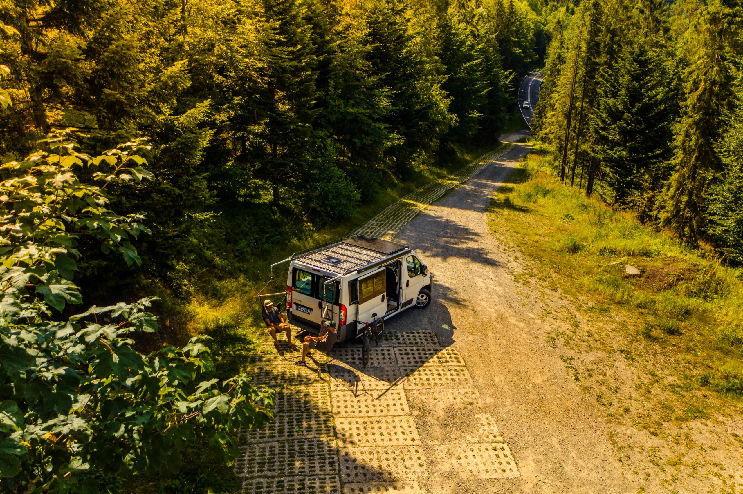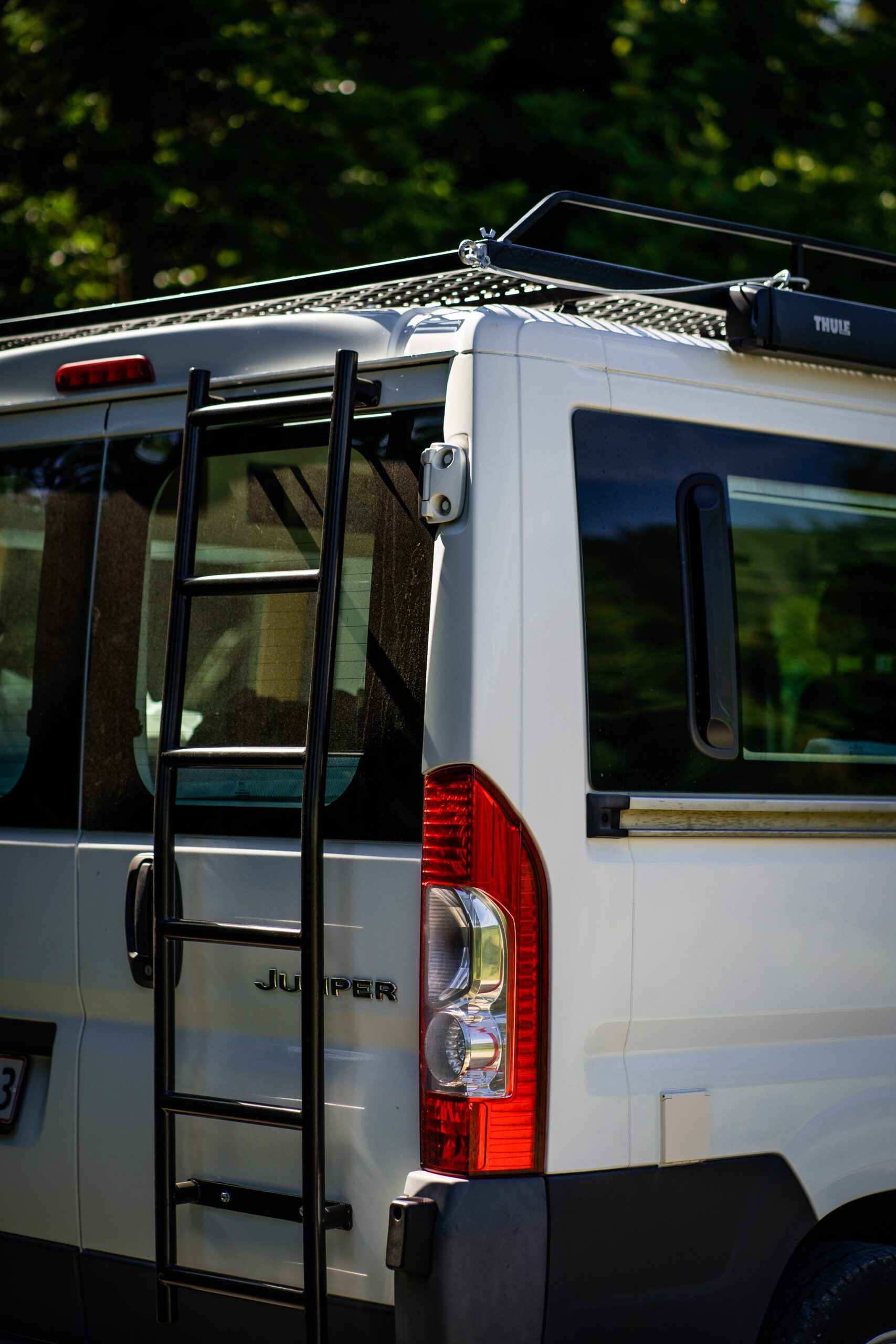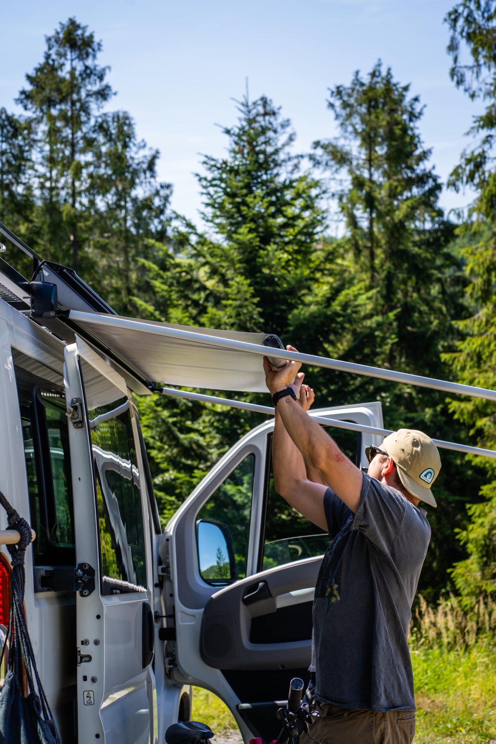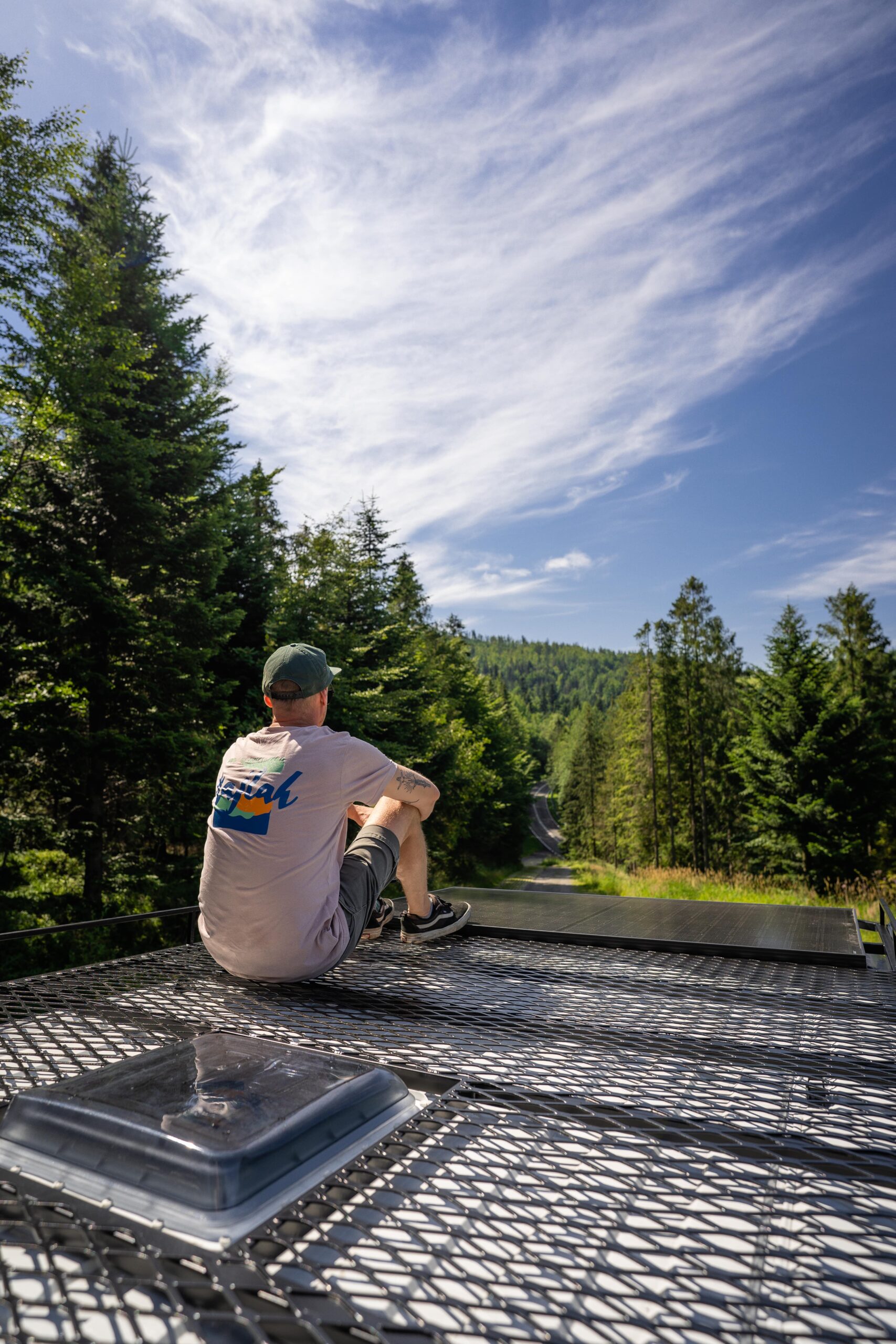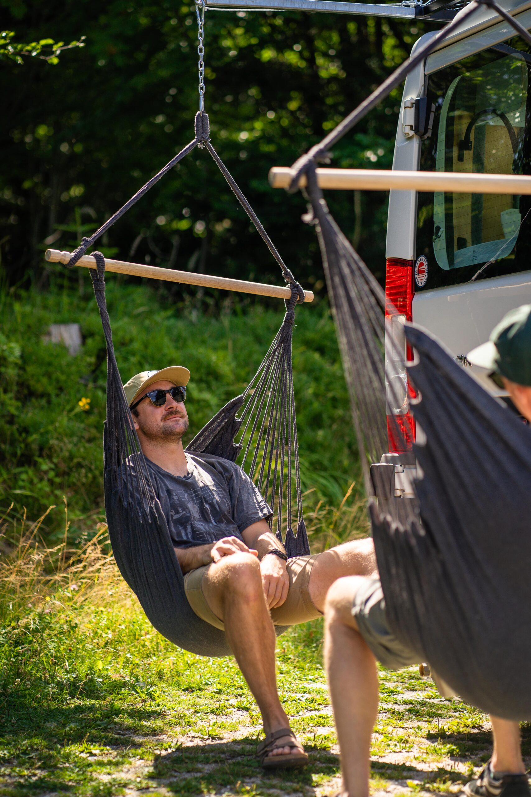 Na dachu kampera wykonaliśmy customową platformę wykończoną blachą perforowaną. Z przodu platformy umieściliśmy duży panel solarny, a z tyłu system wysuwanych belek do hamaków brazylijskich. Platforma jest maksymalnie szeroka, co sprawia, że jest na niej mnóstwo miejsca – można na niej spokojnie wypić kawę w cztery osoby.