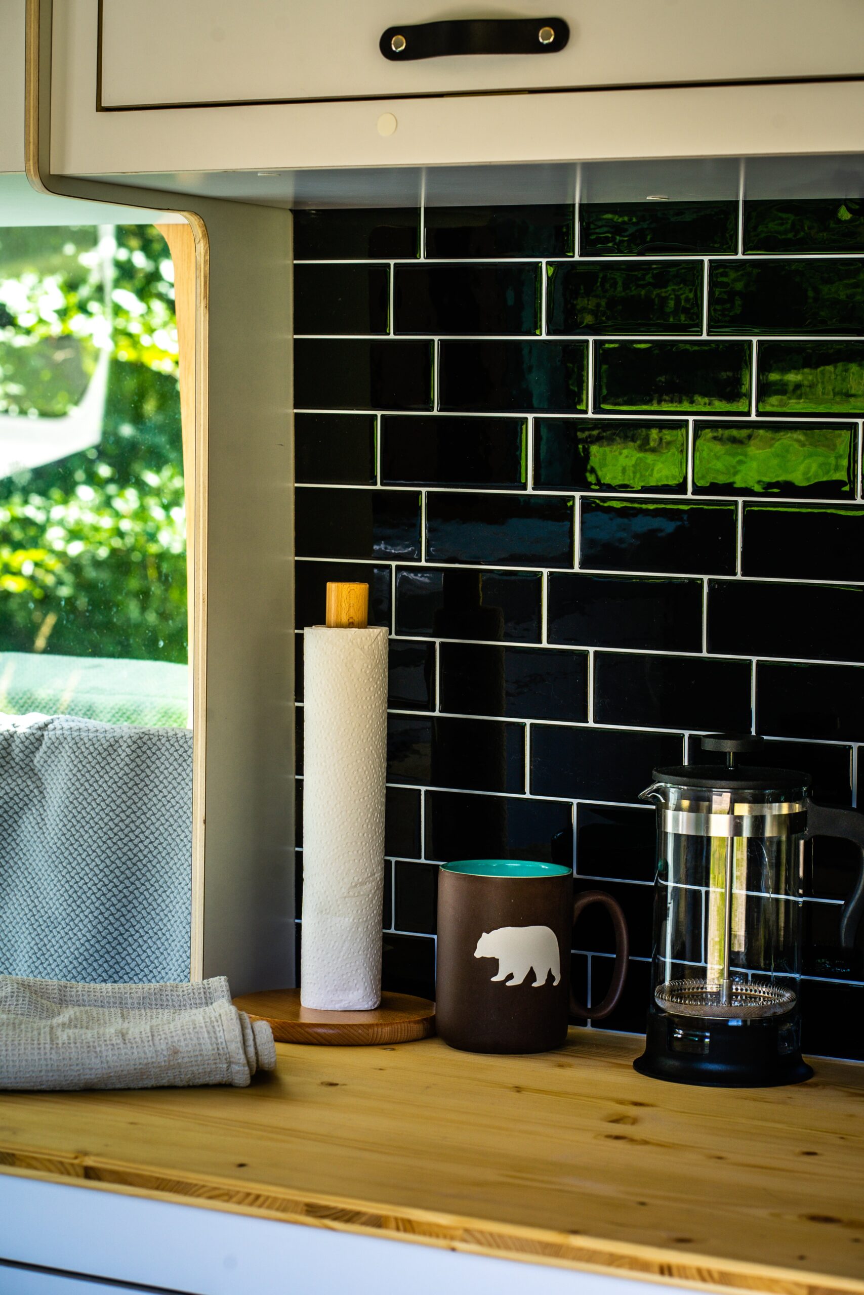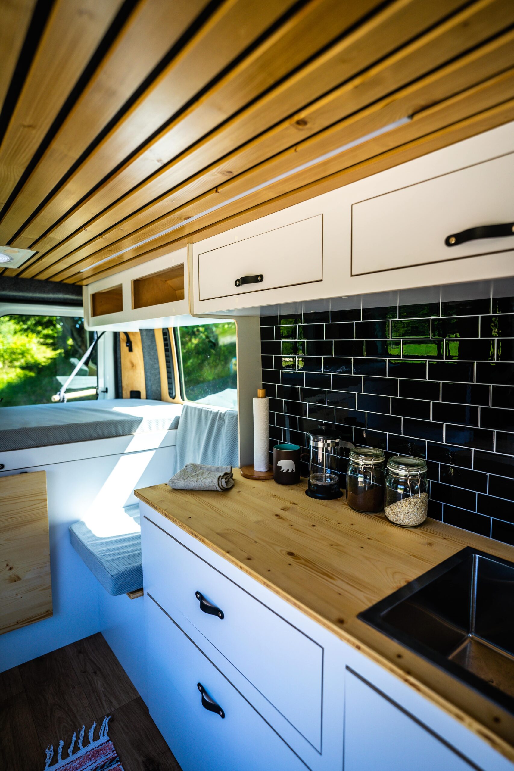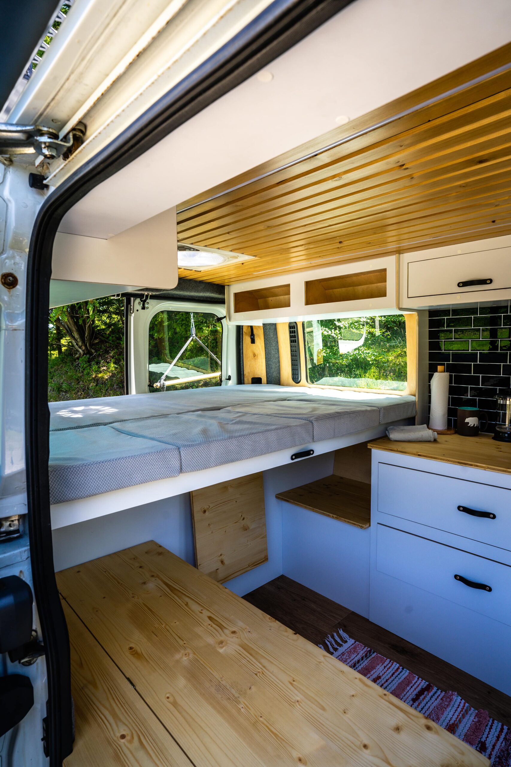 Układ zabudowy składa się z kuchni zlokalizowanej za fotelem kierowcy. Następnie znajduje się mniejsze siedzisko oraz duża kanapa naprzeciwko. Pomiędzy nimi umieściliśmy składany stolik, przy którym można zjeść posiłek lub popracować. Z tyłu samochodu znajduje się łóżko, a właściwie jego większa połowa, ponieważ w minutę obszar do siedzenia zamienia się w pokaźnych rozmiarów łóżko. Wystarczy złożyć stolik, wysunąć podwójną konstrukcję łóżka i położyć na niej materace z siedziska.