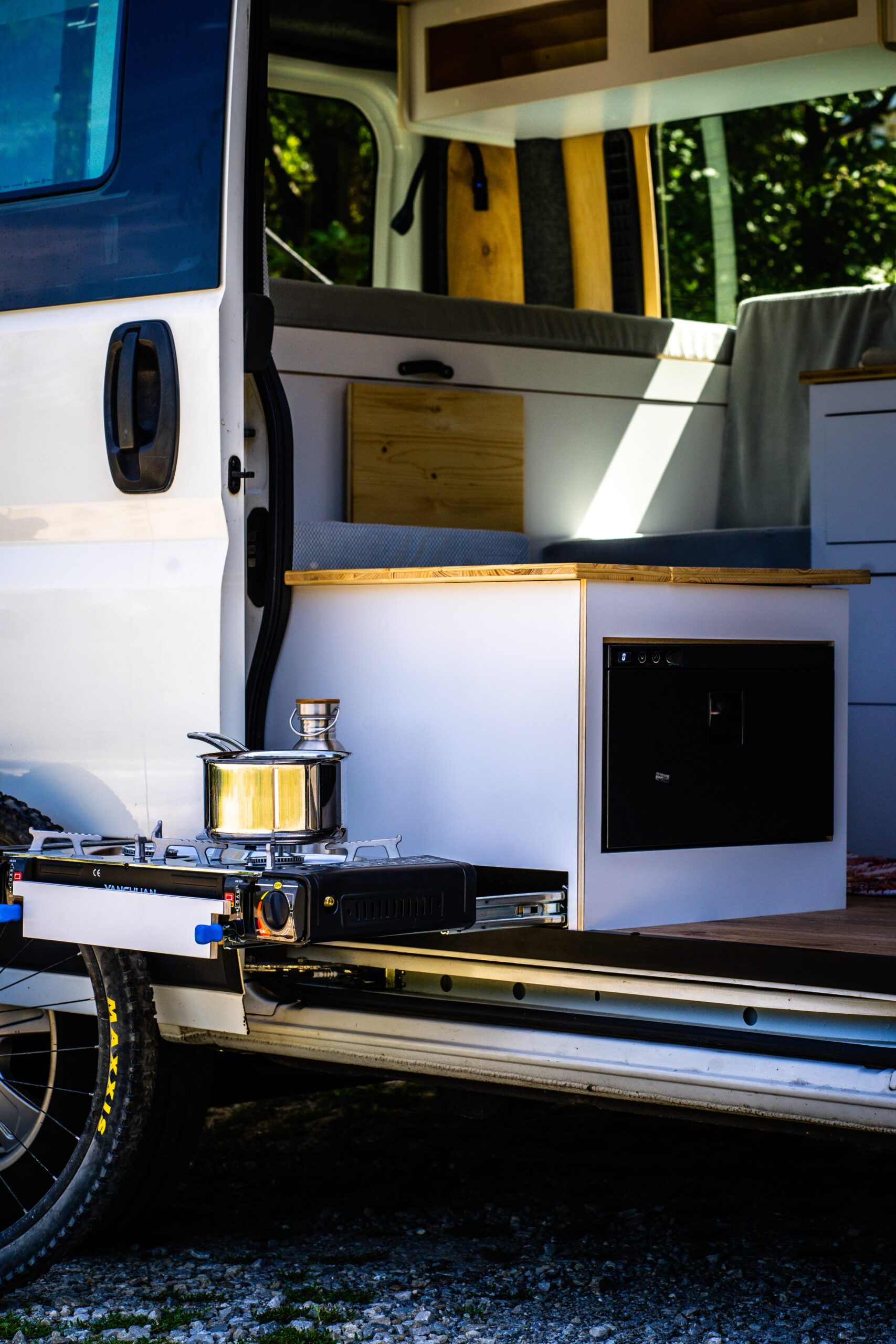 Zabudowa składa się jeszcze z kilku dodatkowych funkcjonalnych rozwiązań, takich jak wysuwany stolik zewnętrzny, na którym można ugotować obiad, wykorzystując przenośną kuchenkę gazową, która jest w wyposażeniu.