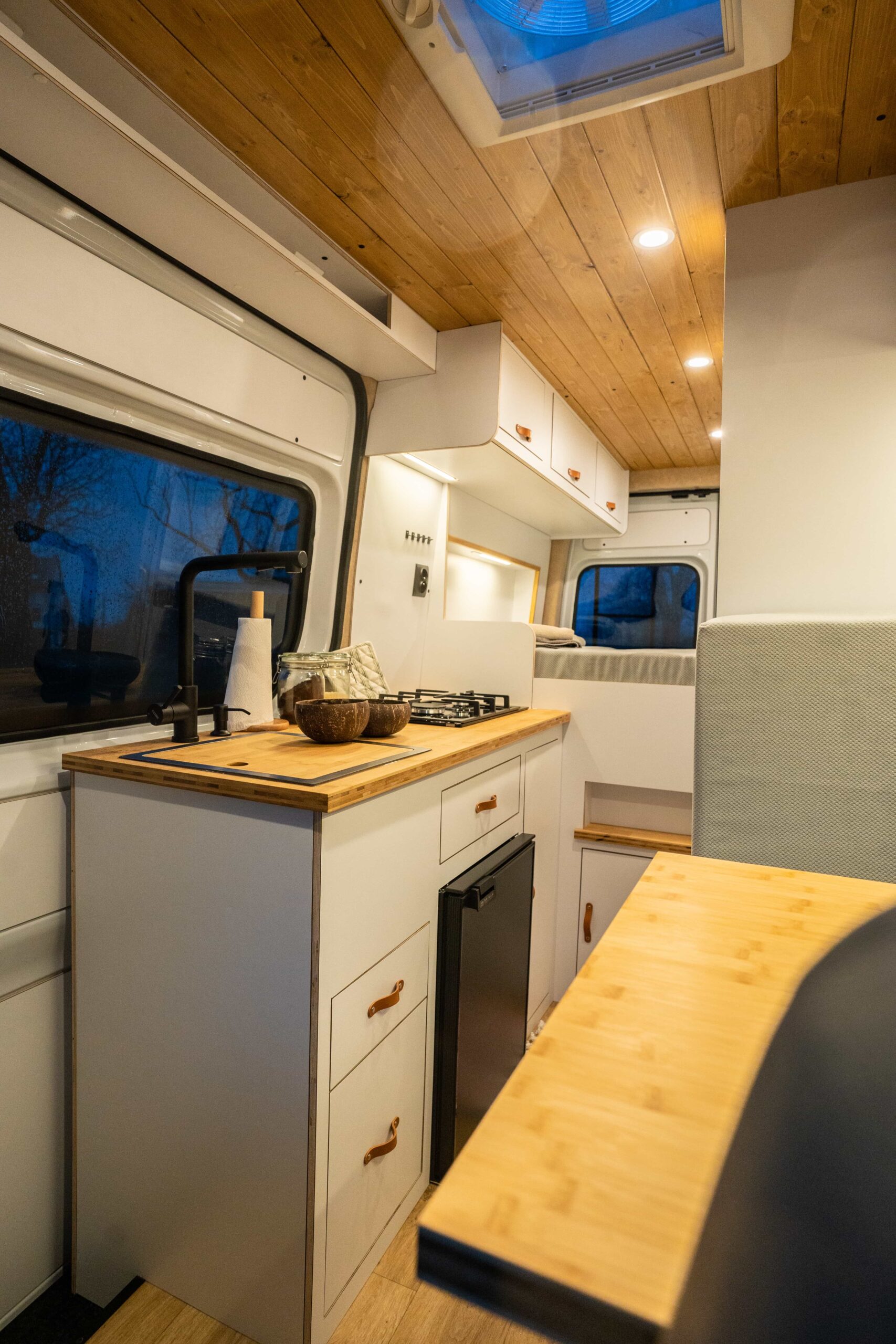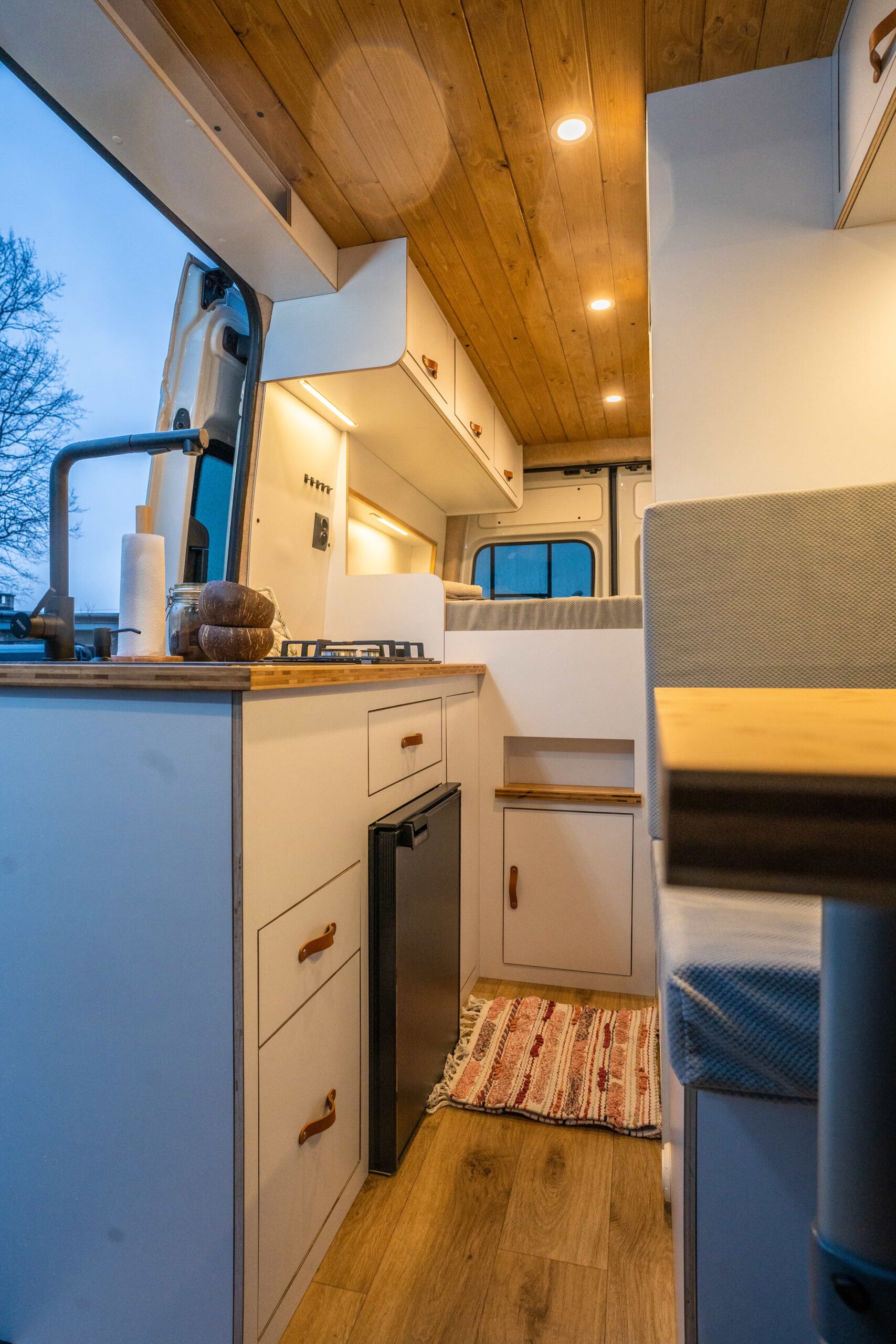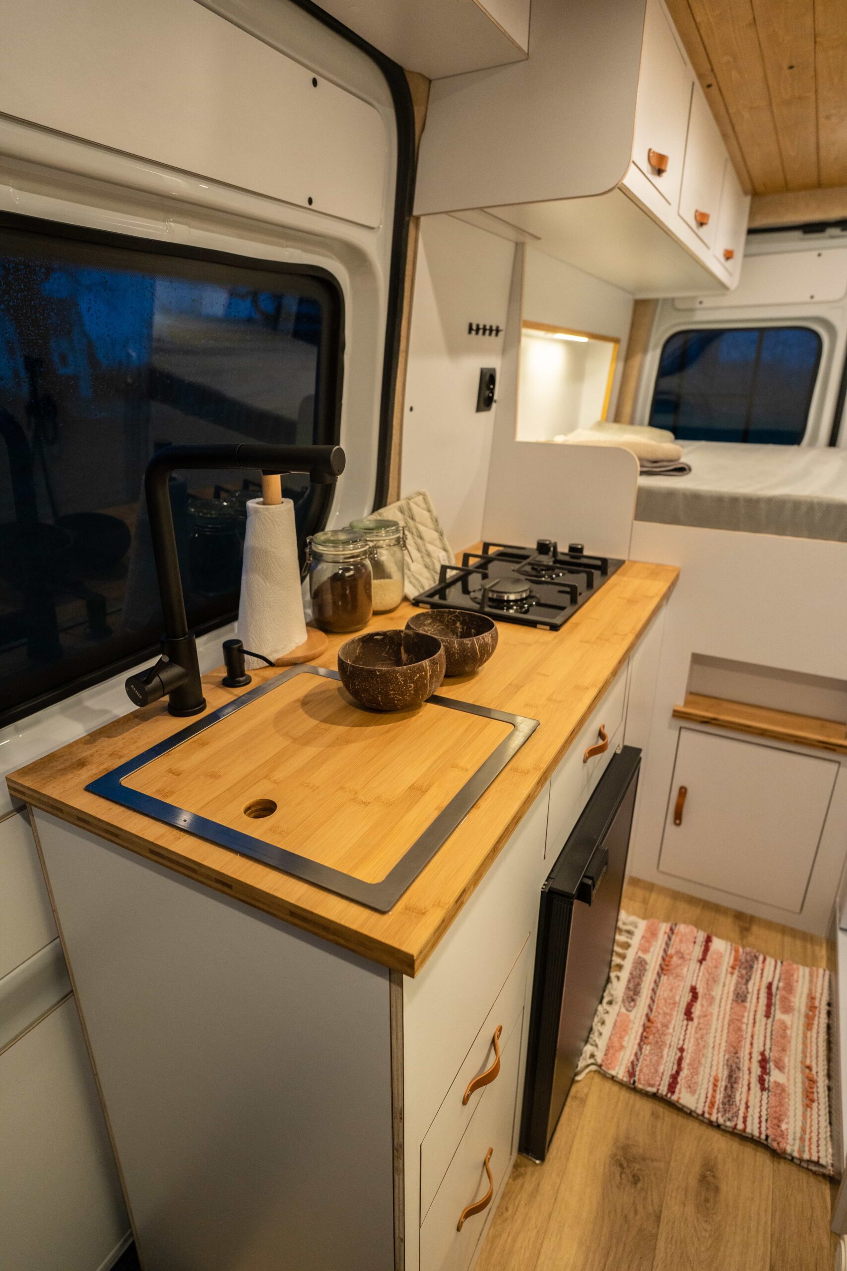 Meble zbudowane są z lekkiej, egzotycznej sklejki i oklejone laminatem. Blaty wykonaliśmy z bambusa, a elementy takie jak zlewy i brodzik to wykonywane na zamówienie produkty ze stali nierdzewnej. Całość zabudowy pięknie komponuje się z sufitem z podbitki pomalowanej w kontrastowym kolorze. Jak zawsze w naszych kamperach, tak i tu staraliśmy się stworzyć jak najbardziej przyjazny, domowy klimat.