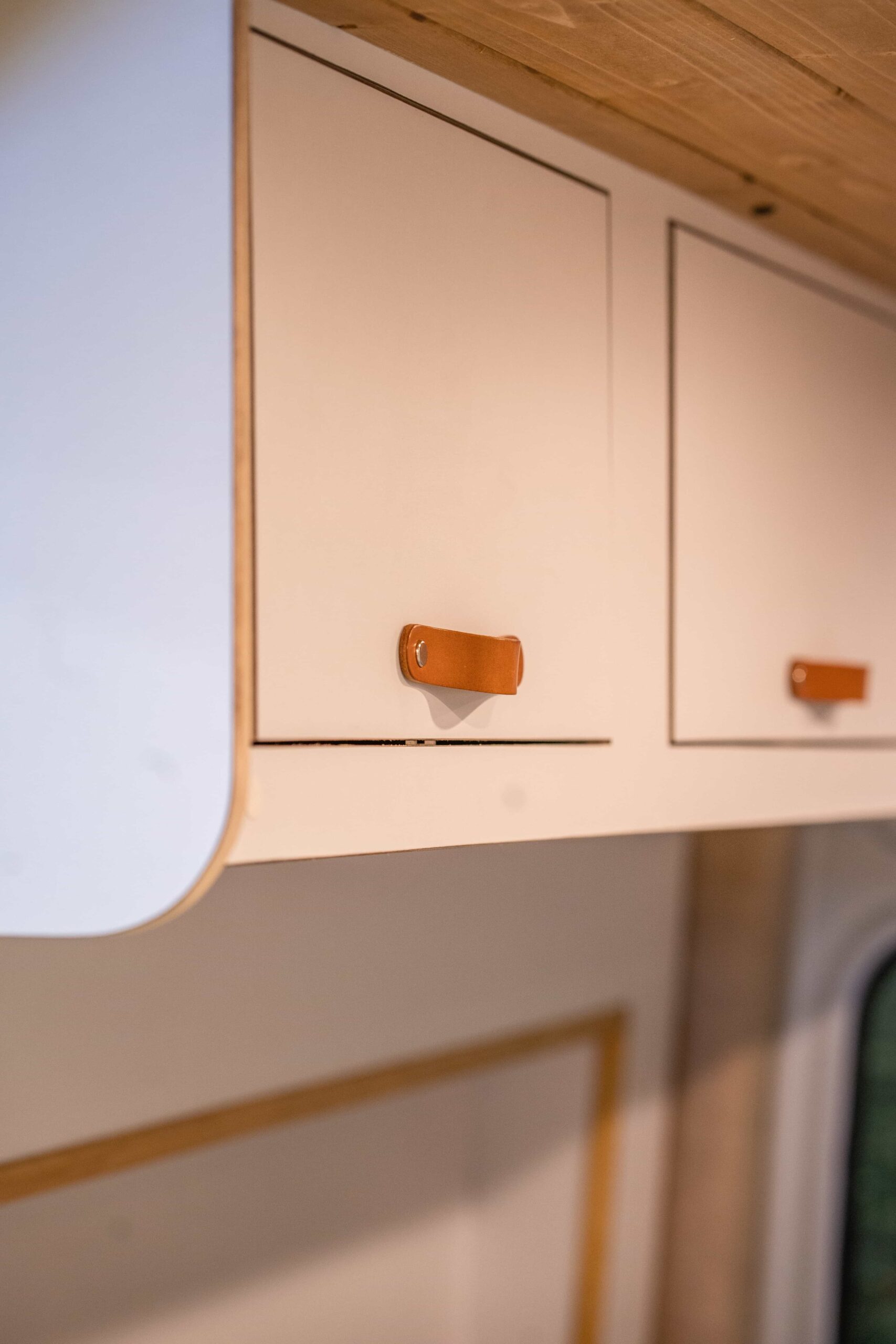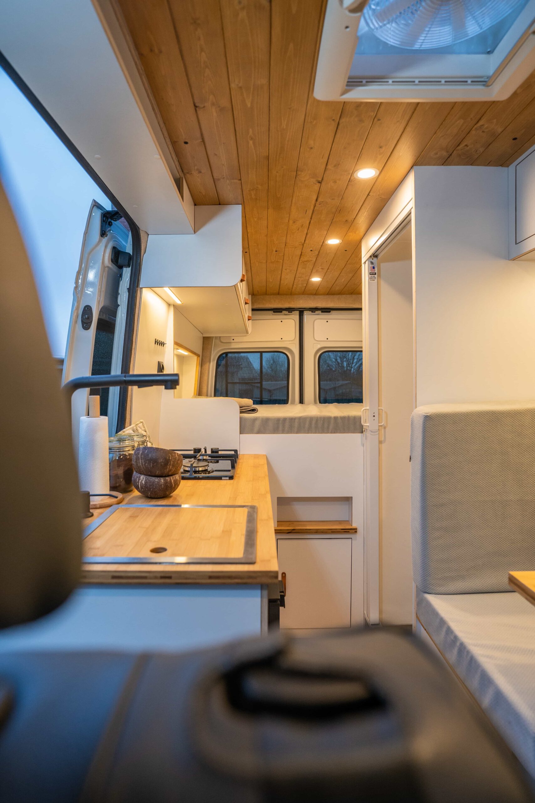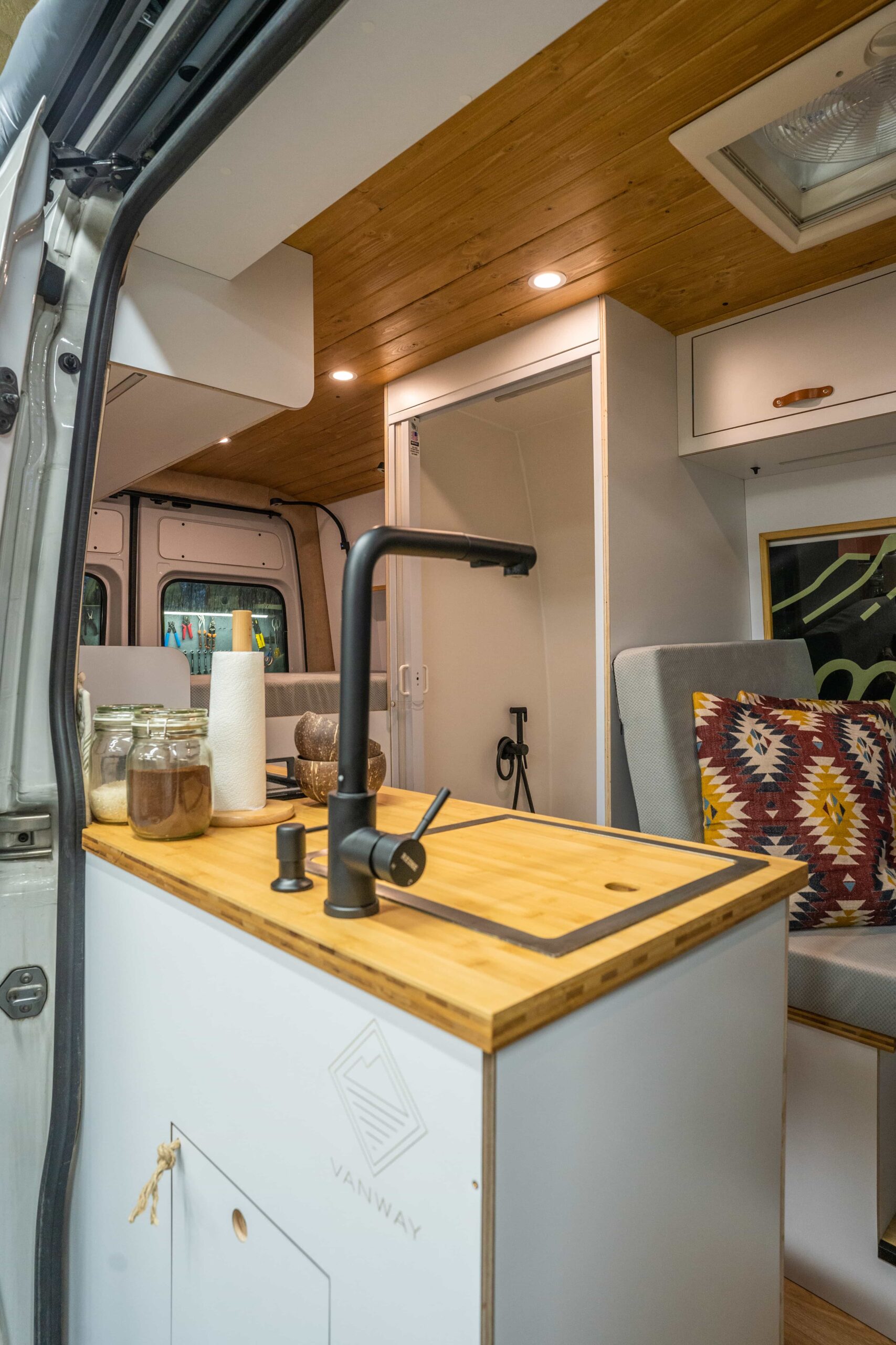 Meble zbudowane są z lekkiej, egzotycznej sklejki i oklejone laminatem. Blaty wykonaliśmy z bambusa, a elementy takie jak zlewy i brodzik to wykonywane na zamówienie produkty ze stali nierdzewnej. Całość zabudowy pięknie komponuje się z sufitem z podbitki pomalowanej w kontrastowym kolorze. Jak zawsze w naszych kamperach, tak i tu staraliśmy się stworzyć jak najbardziej przyjazny, domowy klimat.