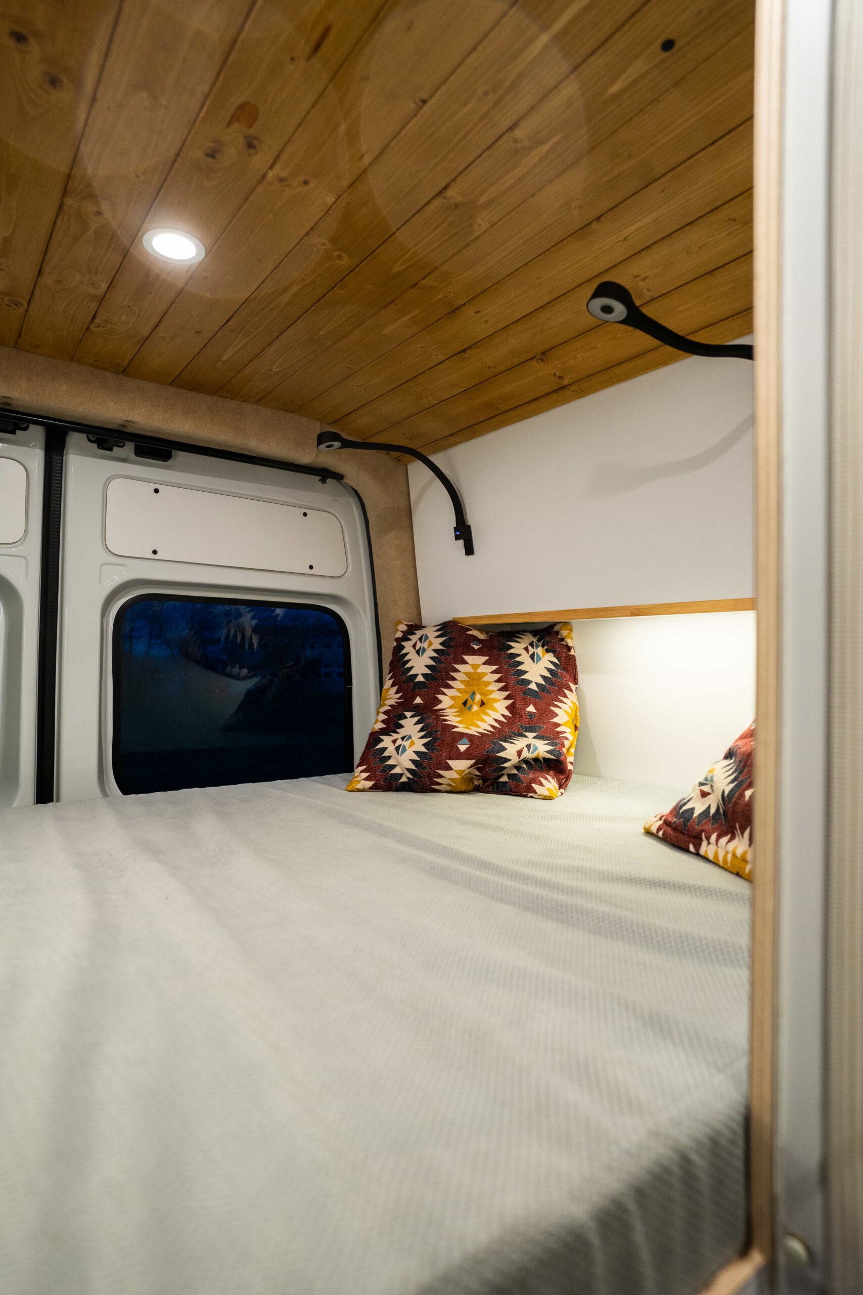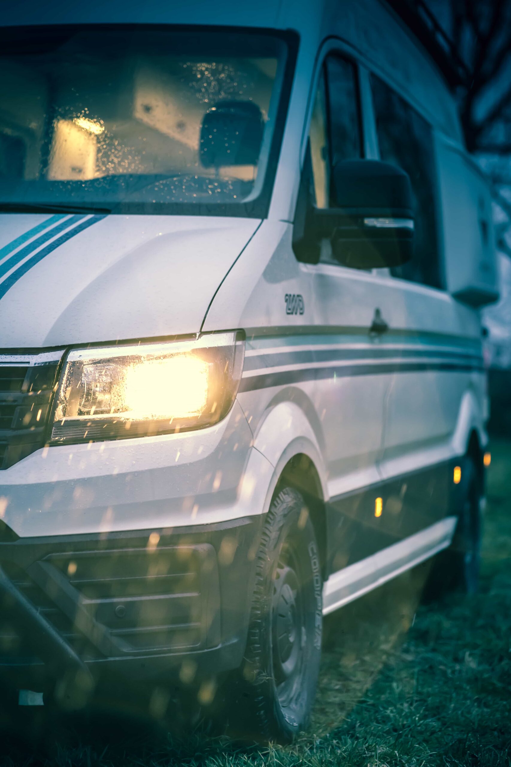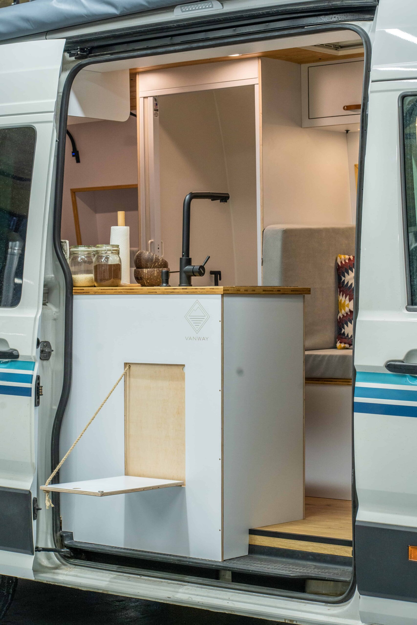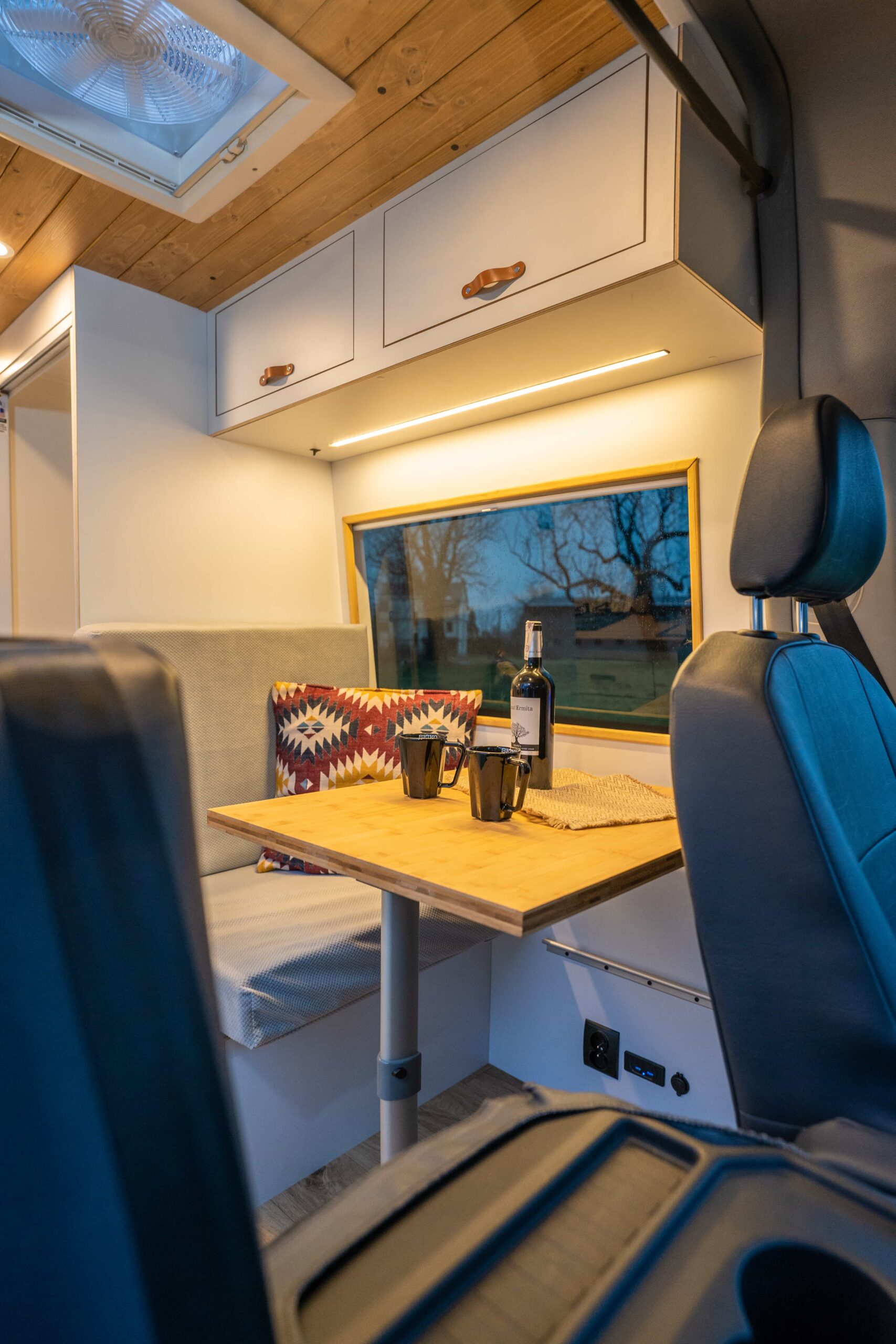 Kamper przyciąga wzrok dzięki subtelnemu oklejeniu oraz terenowym oponom. Układ zabudowy jest dość klasyczny: za szoferką znajduje się stolik i miejsce do siedzenia, a za nim prysznic. Zarówno fotel kierowcy, jak i pasażera jest obrotowy, co pozwala w kilka sekund stworzyć wygodne miejsce do pracy i jedzenia dla trzech osób. Po drugiej stronie znajduje się kuchnia z dużą ilością miejsca do przygotowania potraw. Na samym końcu mamy duże łóżko i przestrzeń bagażową pod nim. Dzięki zastosowaniu poszerzeń w dość wąskim Crafterze, uzyskaliśmy łóżko o szerokości 195 cm.