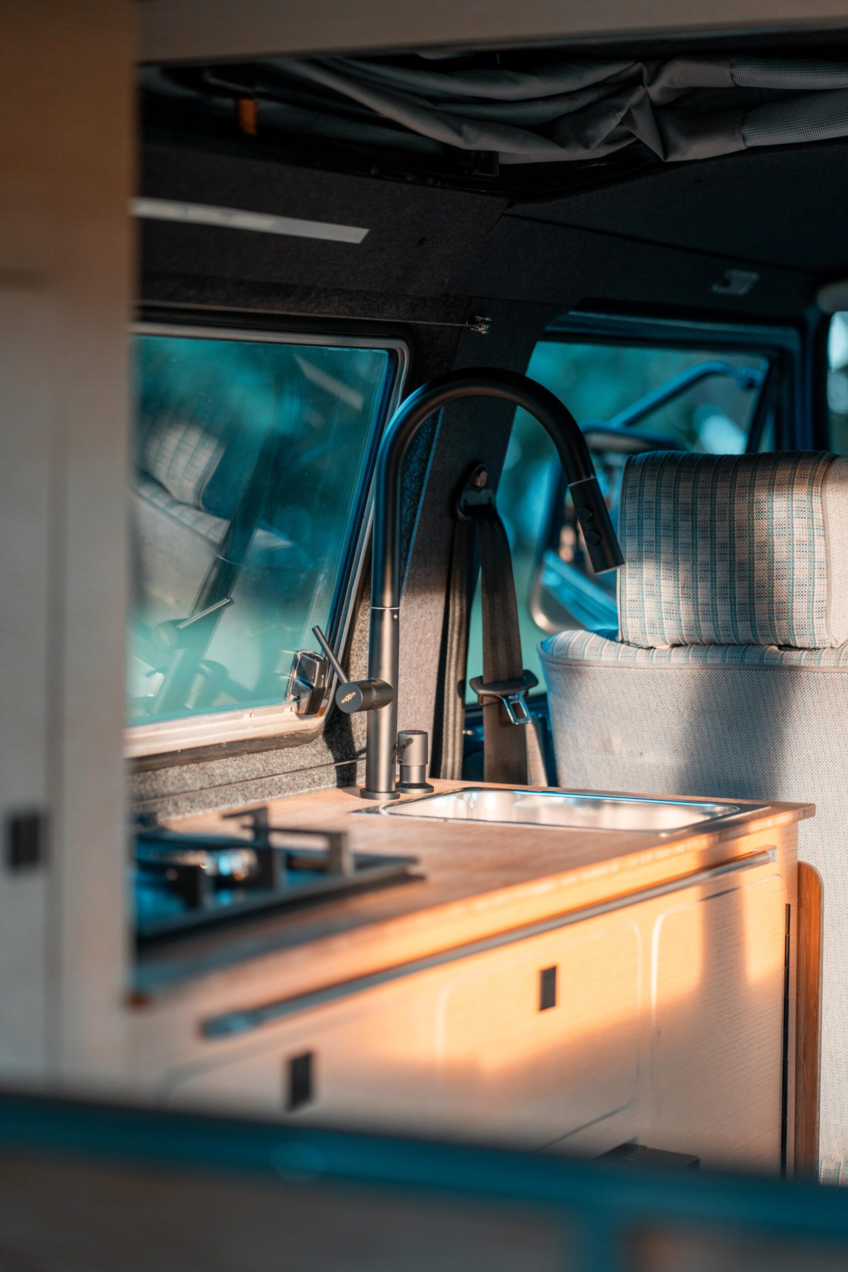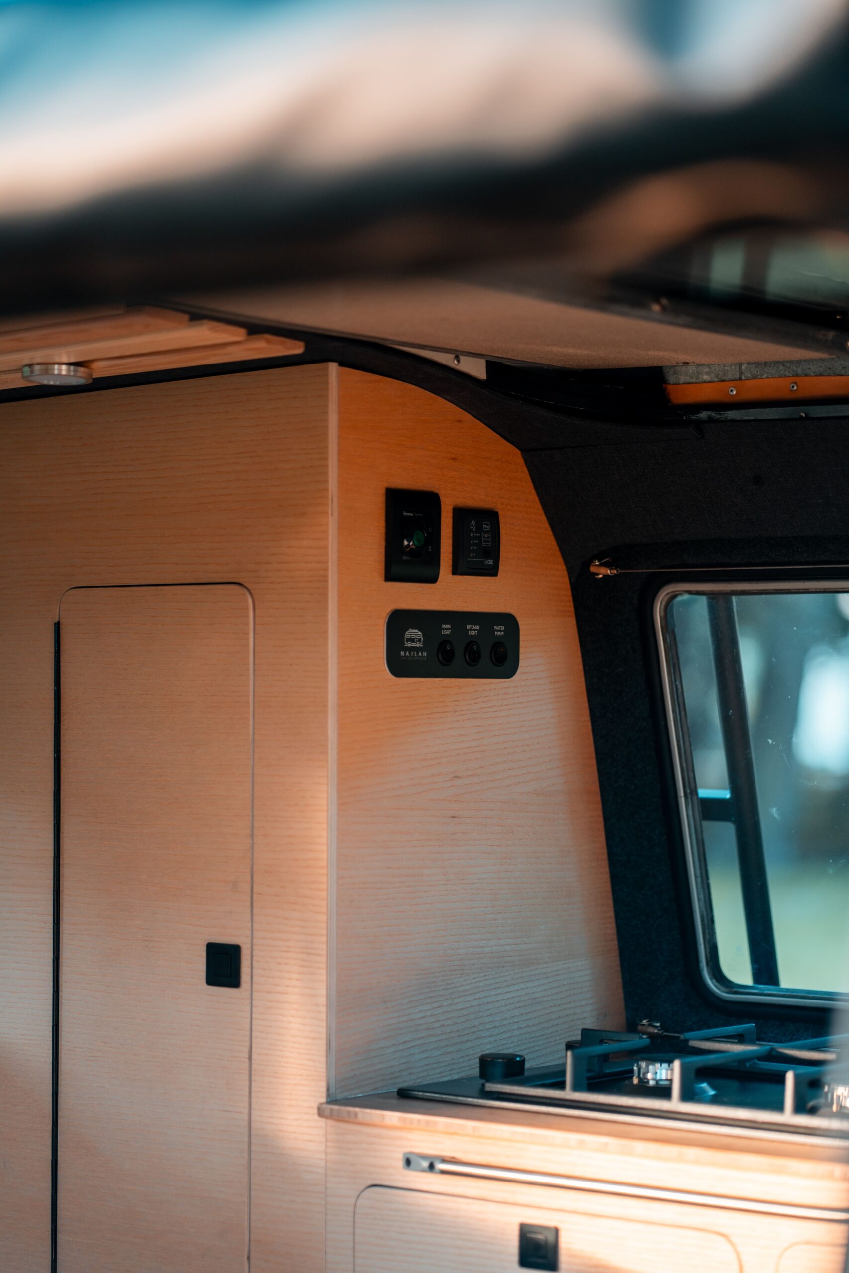 Gdy tylko T3 wjechał do naszego warsztatu, wiedzieliśmy, że musimy zachować jego klasyczny charakter. Zabudowa została wykonana z egzotycznej, super lekkiej sklejki, oklejonej fornirem klasy premium. Pomimo niewielkich rozmiarów kampera, udało nam się zmieścić w pełni funkcjonalną kuchnię z ciepłą wodą.